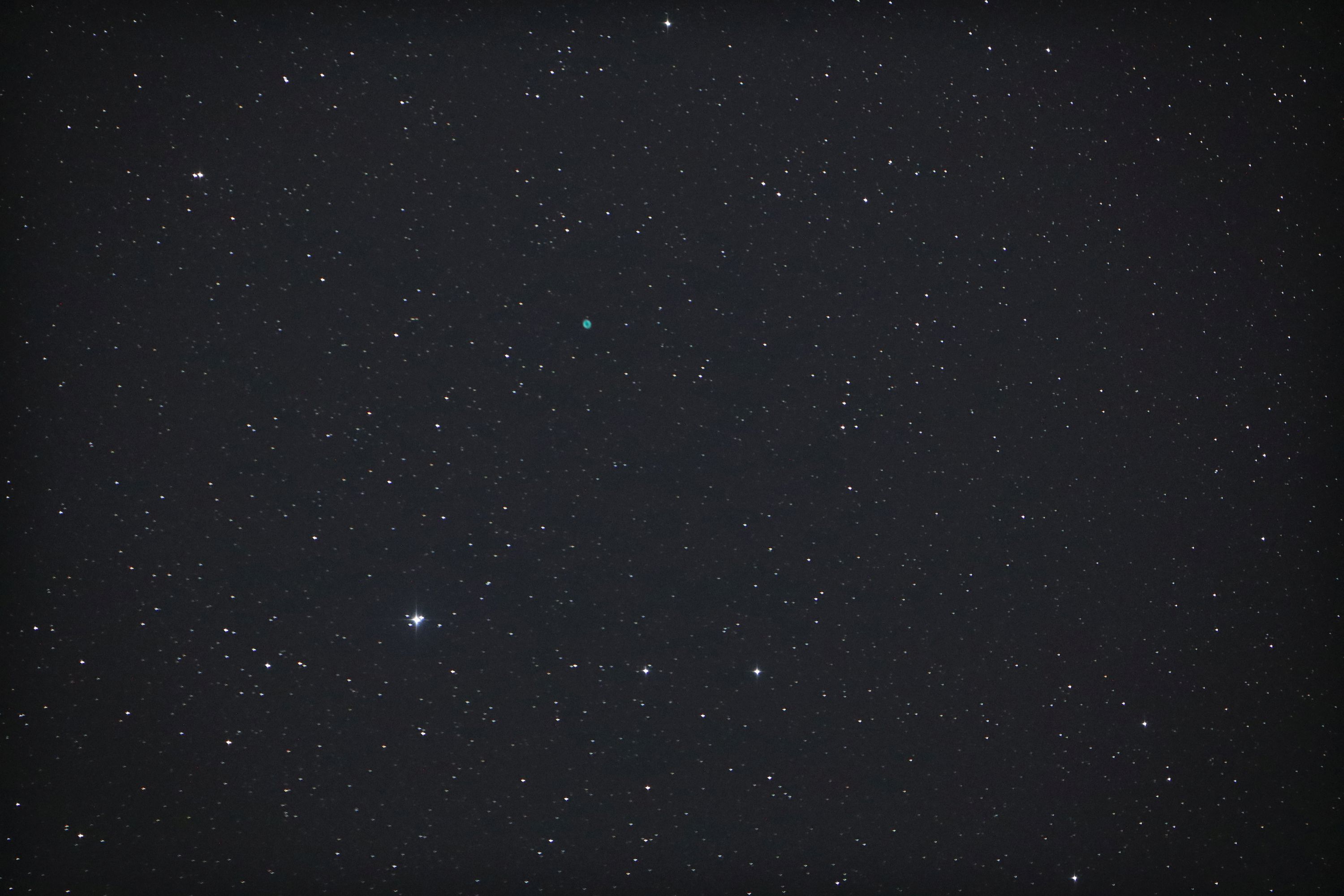 Jedna od prvih test snimaka noćnog neba. Koristio sam EOS M100 digitalni fotoaqparat na ISO 3200 a slika je osvijetljena 10s. Nije dodatno obrađivana, osim što je 2x binan-a (1 piksel je 7,5 mikrometara). Maglica u blizini središta slike je M57. Svjetla, čak i sa tom kamerom ispred svega, ima u izobilju.