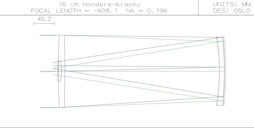 Sam dizajn našao sam u ovoj malo poznatoj knjizi o Shupmann-ovim teleskopima (ISBN-13: 978-0-943396-59-0). Ovaj, danas relativno nepoznati tip teleskopa, koristi se trikom koji mu omogućava da postigne akromatizam uz upotrebu samo jedne vrste stakla. No da, svi već znamo da je nemoguće napraviti akromatsku leću od iste vrste stakla (barem sa pozitivnom žarišnom daljinom), pa je očito da je ovdje u igri neki drugi trik. A taj je da je jedna leća u sistemu zapravo tzv. mangin-ova leća. Takva leća je kombinacija leće i zrcala i obično se izvodi tako da je druga ploha leće zrcalna (posrebrena ili aluminizirana). Svjetlo u takvu leću ulazi, odbija se od zrcalnog sloja na drugoj plohi leće i vraća se natrag. Time se, uz ostalo, kromatska pogreška leće povećava dva puta (svjetlo dva puta prolazi kroz leću). Ako je takva leća negativna, to omogućava akromatsku kombinaciju sa prvom lećom uz konačnu i pozitivnu žarišnu daljinu. Dodat ću još samo da je kod nekih dizajna mangin-ova leća izvedena kao kombinacija obične negativne leće i udubljenog zrcala.