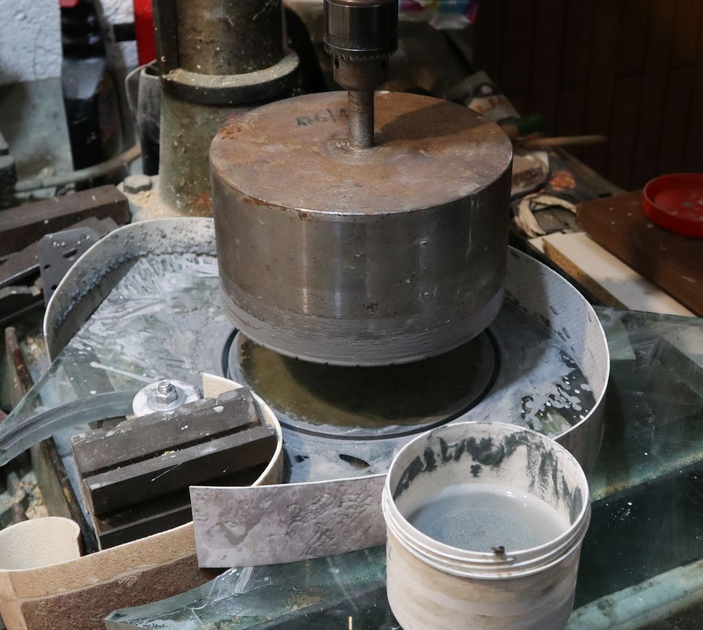 Staklo koje sam imao bilo je u pravokutnim komadima, trebalo je dakle izrezati okrugle diskove na neki način. Koristio sam se klasičnom metodom izrezivanja metalnom krunom (doslovno šuplja cijev tanke stijenke) koja se okreće u stupnoj bušilici. Između krune i stakla stalno se ubacuje grubi brusni prah (do sada sam koristio sve gruboće od #40 do #100, ovisno o tome što mi je bilo pri ruci), i on polagano urezuje okrugli kanal u staklo. Stupna bušilica je bitna radi stabilnosti. Ovo je moguće napraviti i ručnim rezanjem, tj. ručnim okretanjem krune, ali to ide znatno sporije, a stupnu bušilicu imam. Za usporedbu, sa bušilicom sam postizao brzine rezanja od 4-10 mm na sat, a sa ručnom krunom 2-5. Grublji brusni prah reže nešto brže, ali uz znatno veće oštečivanje ruba diska. Kad sam rezao ove diskove, nisam imao grublji prah, pa sam koristio karborundum finoće #100.