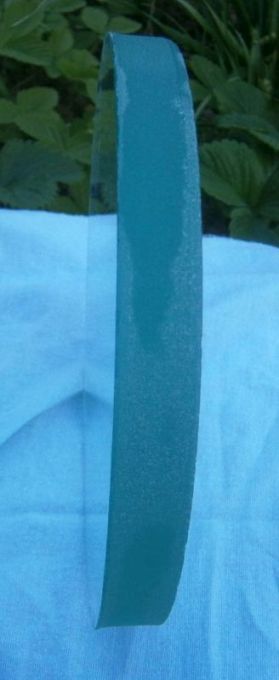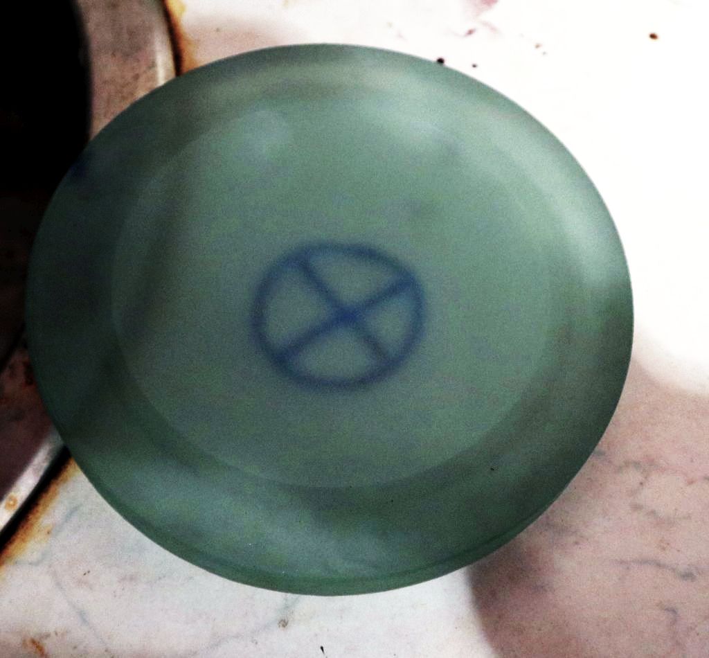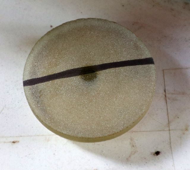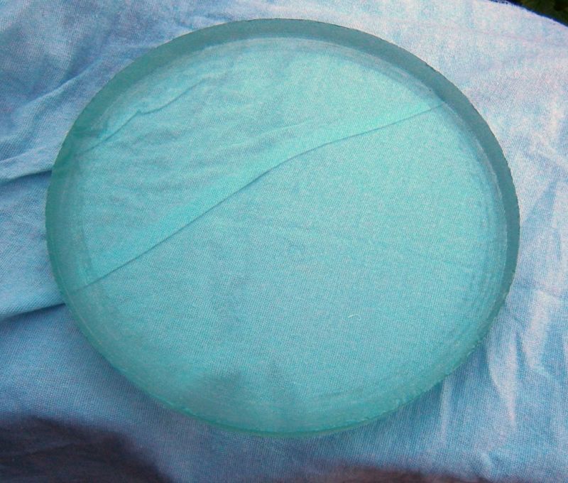 Izrezani disk sada izgleda puno bolje. Donja strana malo je zagrebana jer kod izlaska krune na dnu stakla se disk zaglavi u kruni i zavrti s njom. Kako ga i tako treba brusiti, ne smeta, a može se izbjeći tako da se na dno stakla zalijepi plastična tapeta ili sl. Rub diska kod ovakvog rezanja izlazi malo konično, s izbočinom na donjem rubu. Standardna metoda da se to smanji je da se na donju plohu stakla zalijepi još jedan komad tanjeg stakla pa se reže i kroz njega. Ja sam taj rub kasnije uklonio brušenjem, bilo mi je jednostavnije nego lijepiti veliki komad stakla na veliki komad stakla.