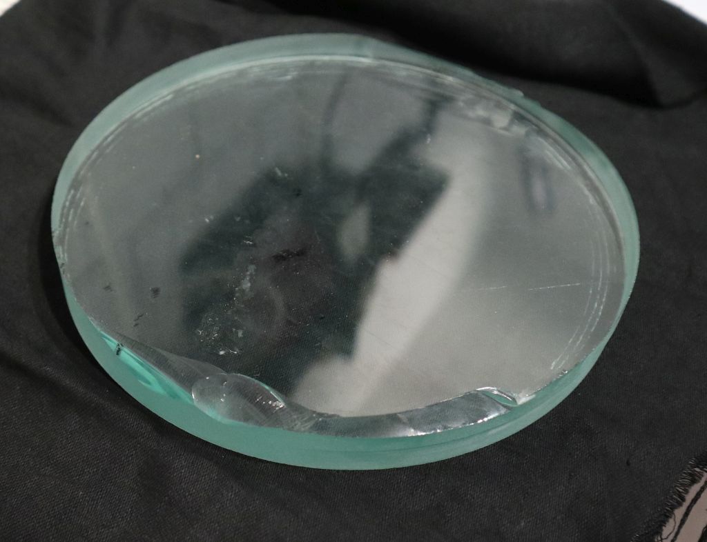 Prvi disk bio je prava katastrofa. Mali drhtaj ruke koji je proizveo prevelik pritisak krune na staklo doveo je do velikih vibracija i teškog loma ruba diska. Ovaj nije za leću, ali je "spašen" kao alat za brušenje jedne od potrebnih ploha. Srećom taman sam imao još dovoljno stakla za nastavak...