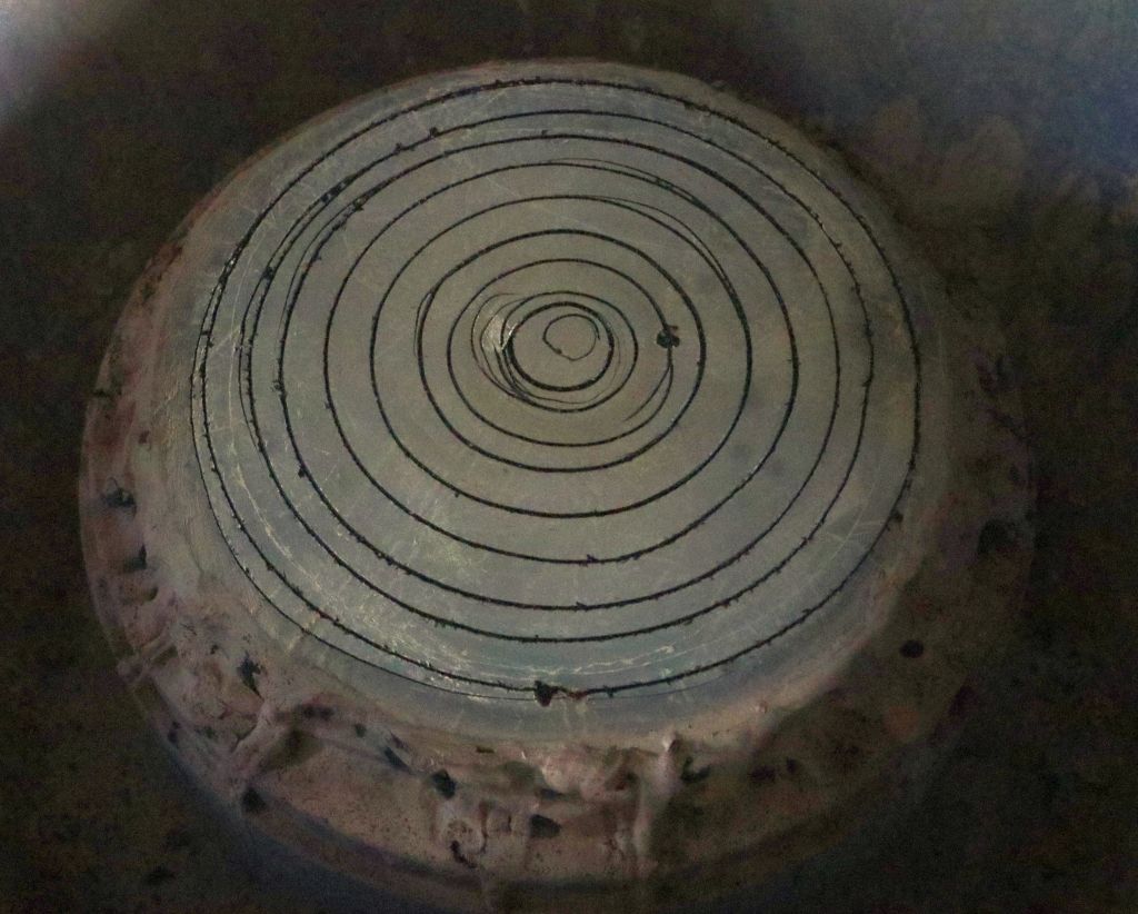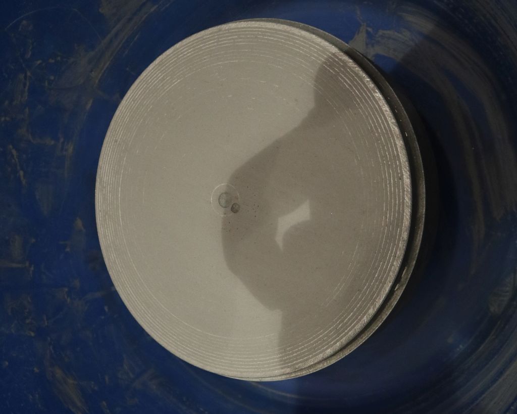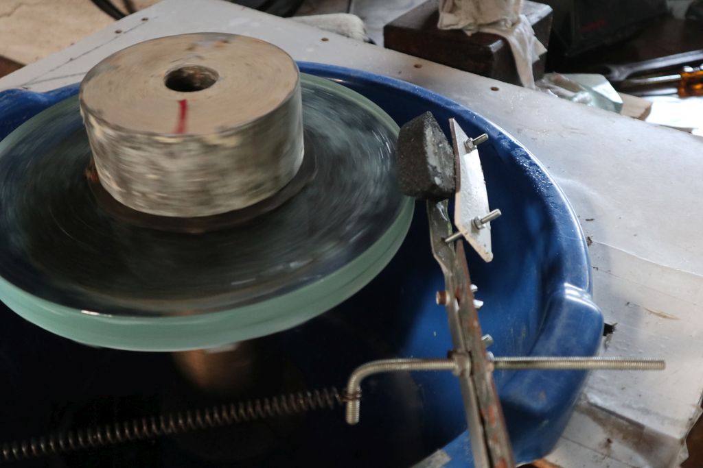 Nemam pribor za tokarenje kalota tako velikog polumjera zakrivljenosti (dosta ga je teško napraviti za ispupćene kalote), pa sam išao metodom koncetričnih diskova. Kod toga se odabere debljina pojedinog diska, recimo 0,5 mm pa se računaju promjeri diskova koji, složeni jedan na drugog od ruba do sredine otprilike opisuju kuglinu plohu potrebnog polumjera zakrivljenosti. Mali excell program riješi taj račun u sekundi, a stepenice koje tvore rubovi pojedinih diskova brzo se izbruse i prevedu u kuglinu plohu. To se lijepo vidi i na gornjoj slici, sredina se već potpuno izbrusila, a na rubovima su samo još tragovi stepenica.