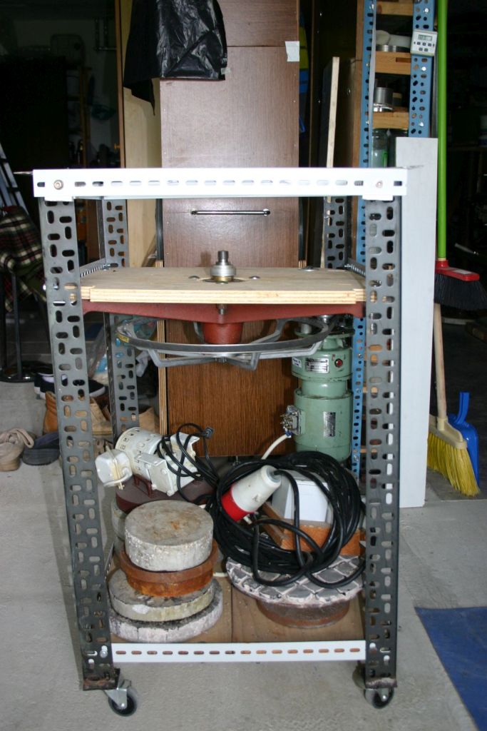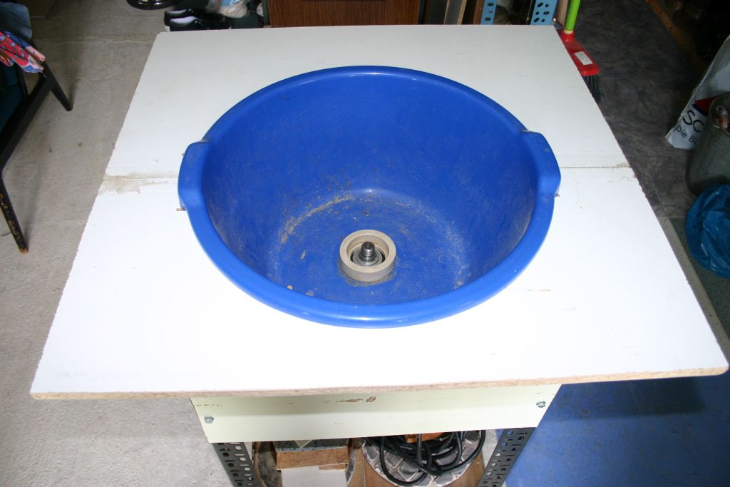 Gornja ploča je od iverice prevučene tvrdim slojem koja je svoj prvi život proživjela kao kuhinjski ormar. Lavor u sredini prikuplja brusni prah i blato nastalo brušenjem. Alati za brušenje (ili nosači diskova) se montiraju na navoj na osovini. Nisam mudrovao, kopirao sam sistem koji je na IRBu imala profesionalna mašina za brušenje: navoj M20 sa širokim ravnim dosjedom na dnu.
