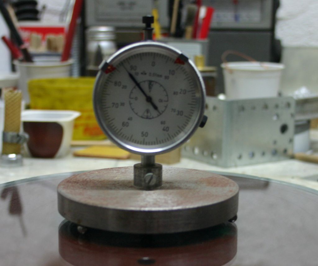 Kod brušenja se polumjer zakrivljenosti mjeri sferometrom. Ima ih nekoliko vrsta, a ja najčešće koristim sferometar sa čašicom. Radi se o okrugloj metalnoj čašici čiji rub definira polumjer mjerenja (nutarnji za ispupčene i vanjski za udubljene plohe) i u čijoj sredini se nalazi neka mjerna sprava. To može biti obični vijak (i sa običnim vijkom M6 bez problema možete očitati 1/100 mm), mjerna ura kao na ovoj slici, ili čak i pomična mjerka koja ima mogućnost mjerenja udubina. Čašica može biti od bilo čega, ali bolje da je od tvrdog metala, i lako se izradi tokarenjem. Profesionalne čašice su kaljene i fino brušene jer je oštar, dobro definiran rub bitan za toćnost mjerenja. Ja taj luksuz nemam, pa sam pažljivo na ravnoj ploči samo fino pobrusio rub. Promjer čašice lako se uz dovoljnu točnost izmjeri pomićnom mjerkom. Zbog razno-raznih faktora mjerenje dubine sa točnošću većom od nekoliko mikrometara je vrlo složeno, a nama je i točnost od 1/100 mm sasvim dovoljna. Što je čašica veća, mjerenje je naravno točnije, a ja obično koristim čašicu koja je u promjeru 80-90% promjera same plohe, ako imam tako veliku.