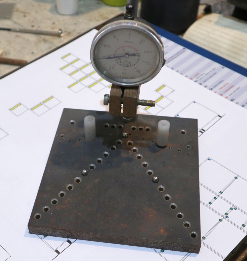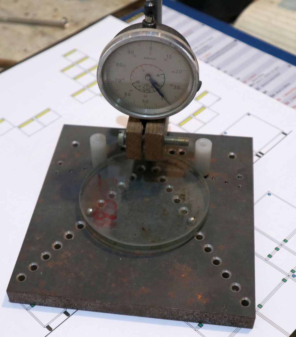 Bitno je da je donja ploča čvrsta, dakle deblji komad metalne ili kamene (može i staklene) ploče. Uočit ćete na njoj niz rupa koje tvore slovo "V". Rupa u vrhu nalazi se točno ispod mjesta na kojem će ticalo mjerne ure dirati gornju plohu leće. U nju se stavlja metalna kuglica na kojoj će leća ležati. Druge dvije kuglice stavljaju se u krakove slova "V" tako da su ispod leće, blizu njenog ruba. Te tri kuglice definiraju ravninu u kojoj leži leća za vrijeme mjerenja. Ako koristite staklenu i li kamenu ploču, kuglice jednostavno zalijepite na njihovo mjesto epoksidnim ljepilom.