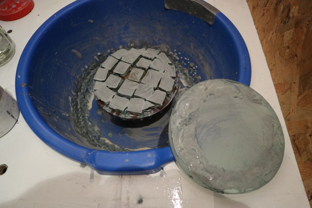 Ova ploha ima veći polumjer zakrivljenosti (783 mm) pa sam odlučio brušenje započeti na staklu. Za test ploču sam uzeo jedan lošiji disk od istog stakla, a za alat za brušenje sam na neku staru kalotu malo većeg promjera zalijepio pločice od 10 mm stakla, koje sam napravio od komadića koje uvijek čuvam za to. Potrebne dimenzije zarežem kotačićem za staklo, ispod "crte" stavim komadić žice (3-4 mm u promjeru je ok) i obje strane stakla lagano pritisnem malom prešicom, a može se koristiti i alat za lomljenje keramičkih pločica. Obavezno treba nositi zaštitne naočale i rukavice, kao zaštitu od komadića stakla koji kod lomljenja mogu letjeti okolo.