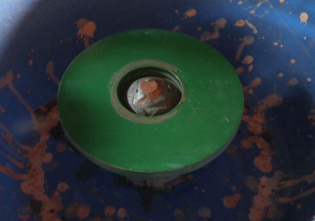E sad, na gornjoj slici vidite kako sam pokušao rezati te diskove. Kruna je golema, na samoj granici onog što sam mogao izvesti sa priborom pri ruci. Staklo je fiksirano na stol bušilice, ali od njega odvojeno komadom starog linoleuma. Linoleum štiti stol bušilice od oštečivanja, ali i stako od loma, jer staklo i metal se ne vole. U direktnom kontaktu mala pogeška u pritezanju stakla na podlogu dovodi do loma stakla. Najmanja brzina bušilice je 370 o/min, nažalost previše za krunu ove veličine (kruna izrezuje disk promjera oko 174 mm, i rupu u staklu oko 180...). Stijenka krune stanjena je na oko 2 mm debljine i njen vrh je običnom turpijom svaka 2-3 cm zarezan da se dobiju utori koji će bolje povlačiti brusni prah sa sobom. Alternativno se kruna može jednostavno zarezivati pilom, fumkcionira jednako dobro.