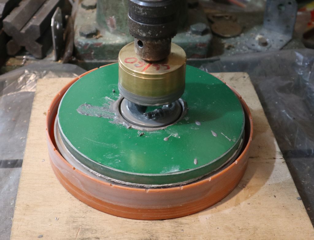 Mašina u akciji. Alat za brušenje (dolje) je u ovom slučaju stakleni disk, a leća koja se brusi je gore (gornja ploha je zaštićena samoljepljivom tapetom). Kod brušenja alat rotira a leća se po njemu pomiće rukom. Nije mi se išlo komplicirati i raditi automatsko pomicanje leće, ionako stalno treba biti uz mašinu i dodavati brusni prah.