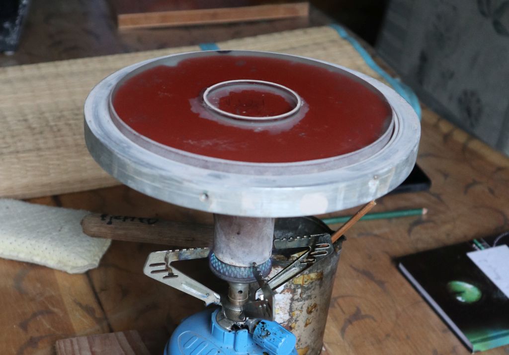 Kod brušenja su alati za brušenje unaprijed priređeni brušenjem na potrebnu zakrivljenost na metalnim kalatoma pa je leća uvijek bila gore, no kod poliranja je bilo potrebno dio posla odraditi sa lećom dolje. Za to sam ju zalijepio u metalni držač koji se stavljao na stroj za brušenje. Ovdje vidite postupak ljepljenja, pri čemu se metalni alat lagano zagrijava dok se ljepilo, koje stavimo u njega, ne rastopi. U tom trenu se na njega stavi leća, koja je istovremeno lagano zagrijana pištoljem na topli zrak. Nakon toga sve se ostavi na miru da se polagano ohladi na sobnu temperaturu. Treba raditi polagano da staklo ne pukne od naprezanja! Za ljepilo sam upotrijebio stari recept iz Twyman-ove knjige: 1 dio voska + 4 dijela kalofonija. Lako se izradi, lijepo lijepi i lako se čisti alkoholom.